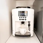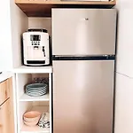 The kitchen amenities at the accommodation feature an electric kettle, a refrigerator, and a stove top, provided in an outdoor dining area.
